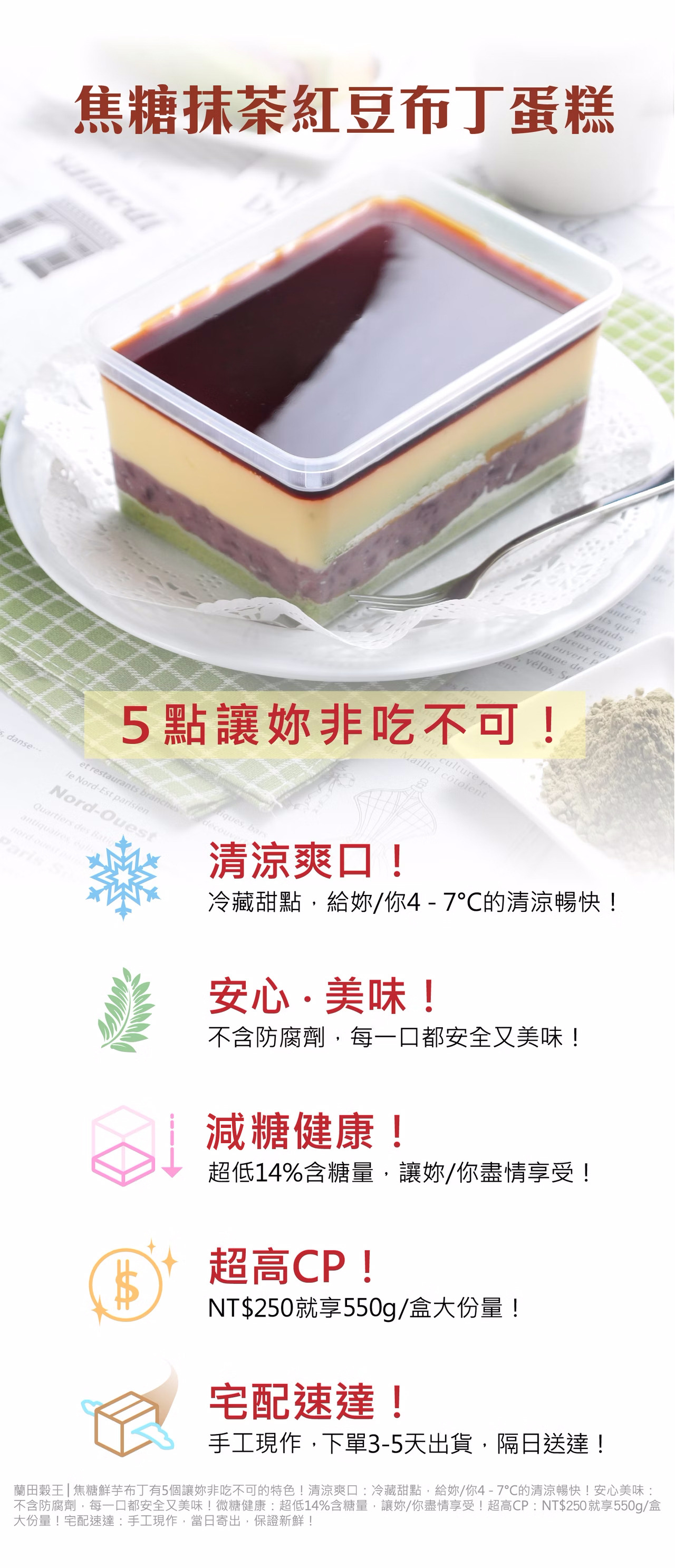 品 名:焦糖抹茶紅豆布丁蛋糕。
